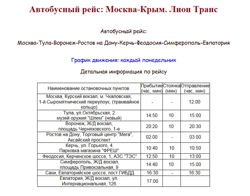 В Евпаторию есть прямые автобусные рейсы из Москвы. Выполняет их компания Лион Транс. На сайте перевозчика можно уточнить время отправления рейса на нужную дату. Из Питера в Москву можно добраться как на автобусе, так и любым другим видом транспорта.