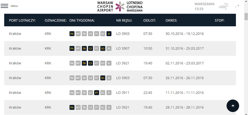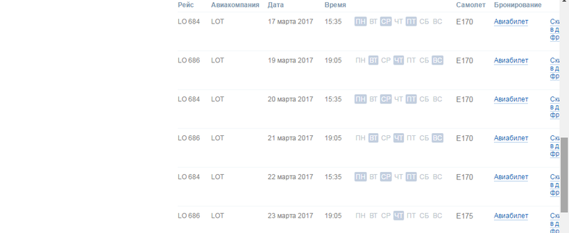 Оказавшись в Варшаве, можно лететь в Краков, но прошу вас заметить, что рейсы также есть далеко не ежедневно, я вам показала сезонное расписание, на котором видны дни вылетов. А до назначенного пункта лететь чуть меньше 50 минут.