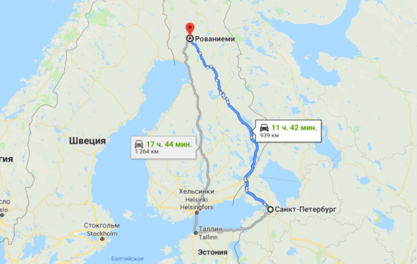Петербург и Рованиеми разделяет почти 1000 км, и проехать это расстояние с учетом необходимости пересекать международную границу получится не меньше чем за 14 часов.