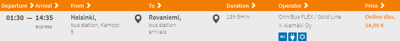 С автовокзала Kamppi финской столицы (Narinkka 3) в Рованиеми ежедневно отправляется всего один прямой автобус. Это автобус компании Koiviston Auto, который выезжает в 01:30 и путь до столицы Лапландии преодолевает за 13 часов.
