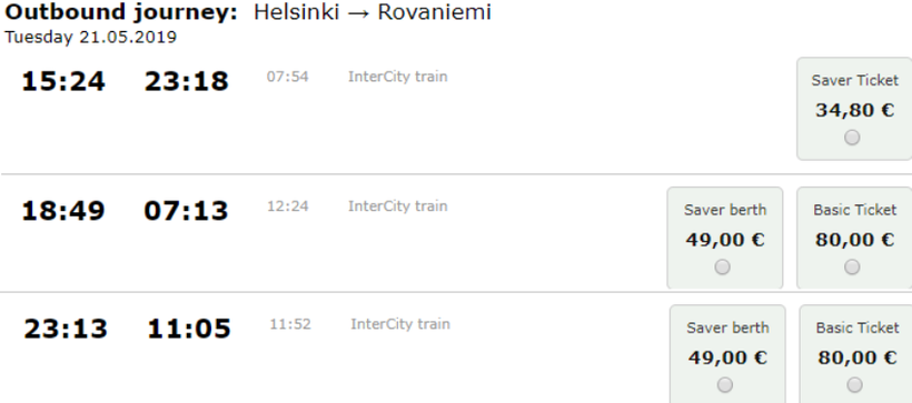 С ж/д вокзала Хельсинки (Kaivokatu 1) в Рованиеми ежедневно отправляется только три прямых поезда: