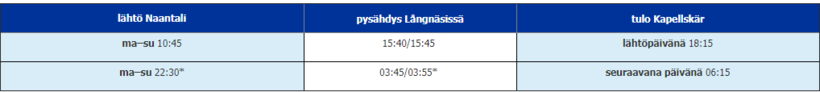 Перевожу на понятный язык. :) Вы садитесь на паром либо в 10:45 утра, либо в 22:30 вечера в финском городе Наантали. Плыть надо до шведского города Капельшер (вовсе не уверена, что название читается именно так). Туда вы приплывете или в 18:15 вечера, или в 06:15 утра. Как по мне, то второй вариант лучше, можно просто проспать всю дорогу. Стоимость переправы лучше узнавать на официальном сайте (ссылочку выше оставила).