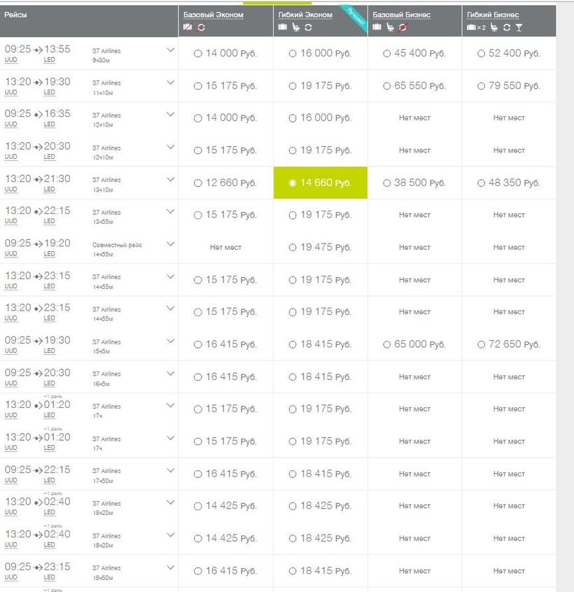 В среднем, стоимость одного билета, на рейс «Санкт-Петербург-Улан-Удэ» от авиакомпании «S7» за месяц до вылета составит: «базовый эконом» -от 12325 рублей; «гибкий эконом» - от 15325 рублей; «базовый бизнес» - от 38500 рублей; «гибкий бизнес» - от 48350 рублей. При этом, при выборе «базового эконома» или «базового бизнеса» возможности вернуть билет нет.