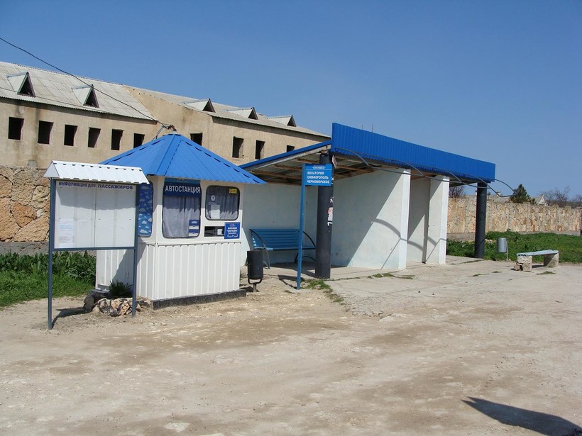 Автобусы в Оленевку ходят дважды в день (10:15, 16:20), поэтому подбирайте время так, чтобы не опоздать, а то придется брать такси. Понадобится еще 1,5 часа, чтобы приехать на автобусную станцию села. На фото ниже вы можете увидеть, как она выглядит, впрочем, это просто остановка со стоящей рядом билетной кассой.
