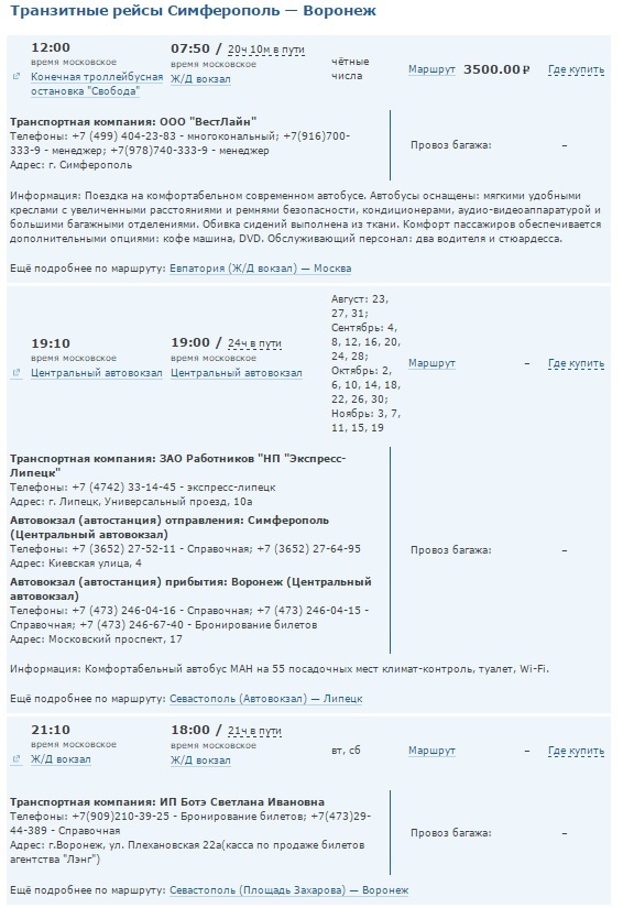 Осуществляется транзитными рейсами, а так же рейсами с пересадкой в Курске. Прямых рейсов от Симферополя до Воронежа нет. Автобусы оснащены: мягкими удобными креслами с увеличенными расстояниями и ремнями безопасности, кондиционерами, аудио-видеоаппаратурой и большими багажными отделениями. Обивка сидений выполнена из ткани.