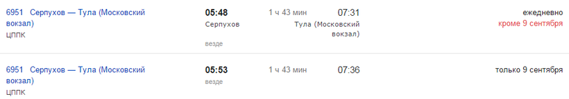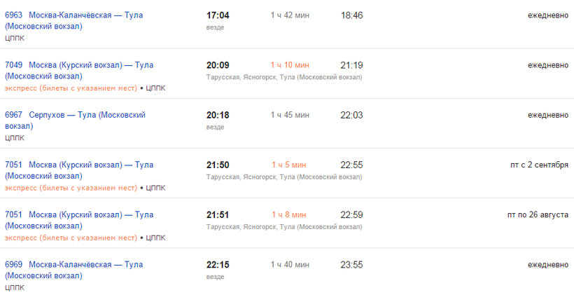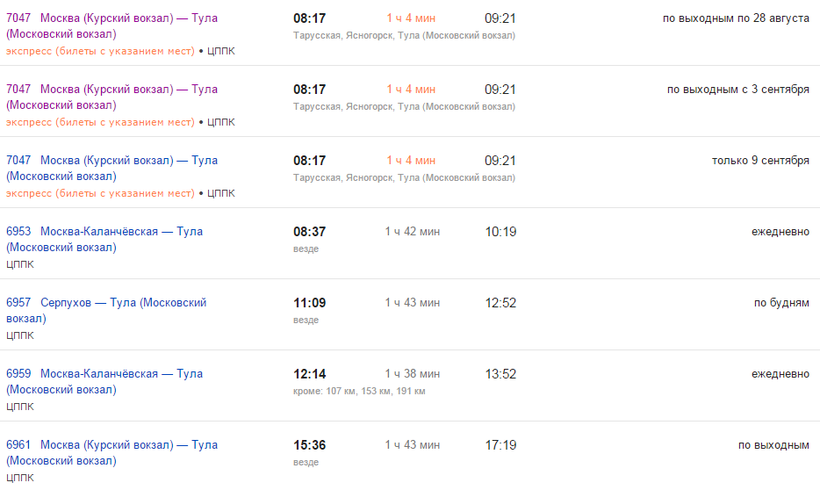 Можно из Серпухова доехать до Тулы на "Ласточке", направляющейся из столицы в Орел. Это самый дорогой и быстрый транспорт в нужном нам направлении. Отправляется этот поезд из Серпухова ежедневно в 9 часов 35 минут, но к поездке стоит подготовиться заранее, потому стоит он на платформе всего 2 минуты. В Тулу на этом транспорте прибудете уже через 54 минуты. Немного дольше выйдет поездка между этими городами на электричках и пригородных поездах, от 1 часа 04 минут до 1 часа 45 минут. Ходят они с 5 часов 48 минут до 22 часов 15 минут, а интервал в разное время неодинаковый.