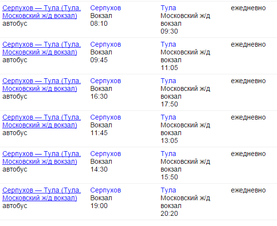 Ежедневно из Серпухова отправляется 6 автобусных рейсов в Тулу. Первый автобус идет в 8 часов 10 минут, последний – в 19 часов, подробное расписание привожу ниже.