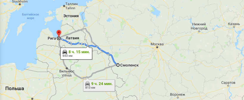 Расстояние между Смоленском и Ригой составляет 550 километров или 342 мили по прямой и 647 километров или 402 мили по автодорогам.