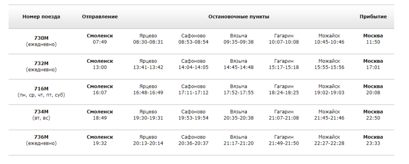 Отправляются «Ласточки» от вокзала Смоленск-Центральный, а в Москву прибывают на Белорусский вокзал.