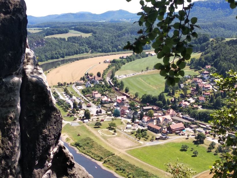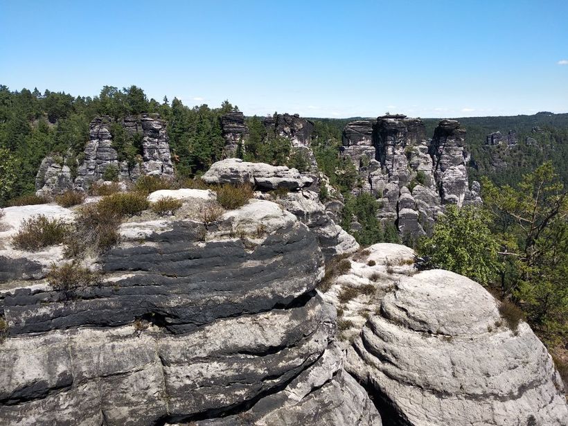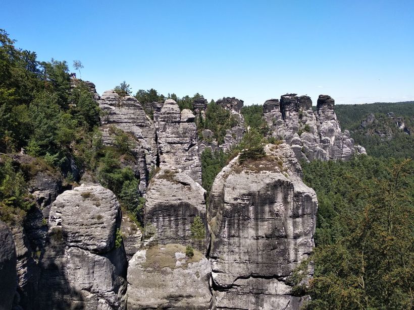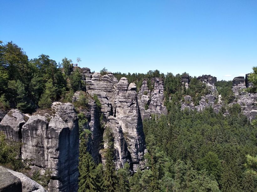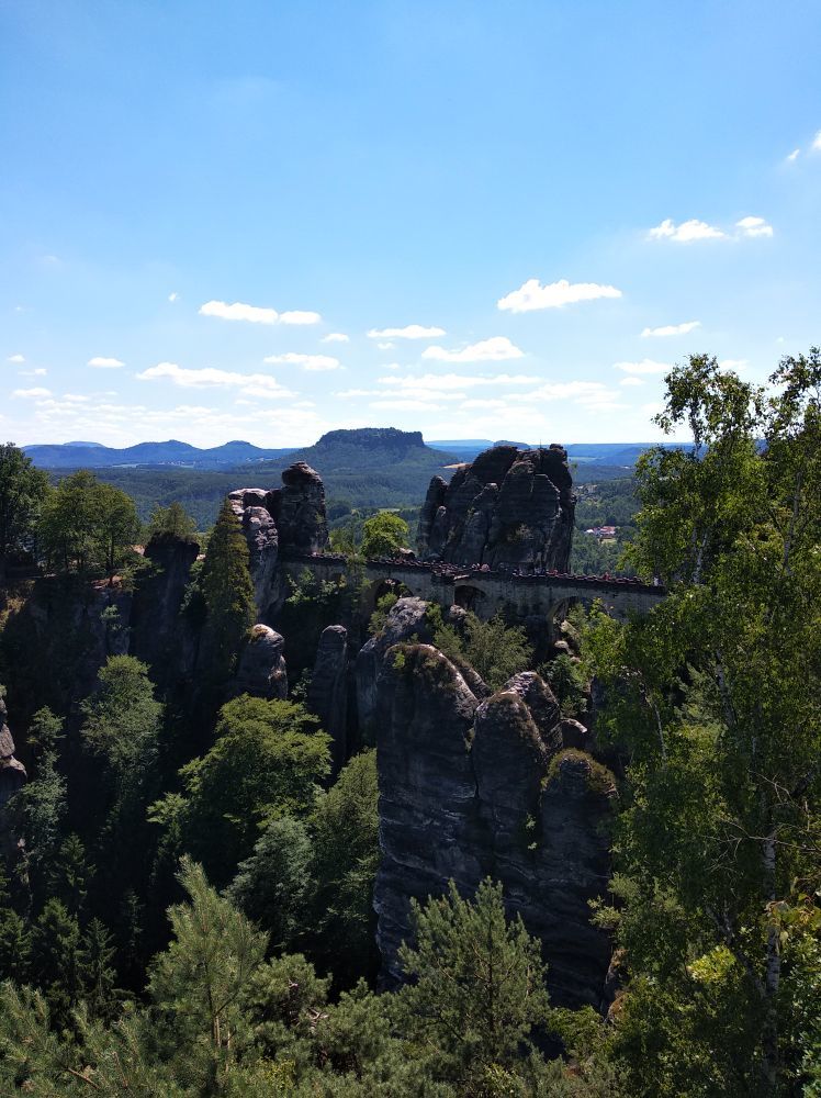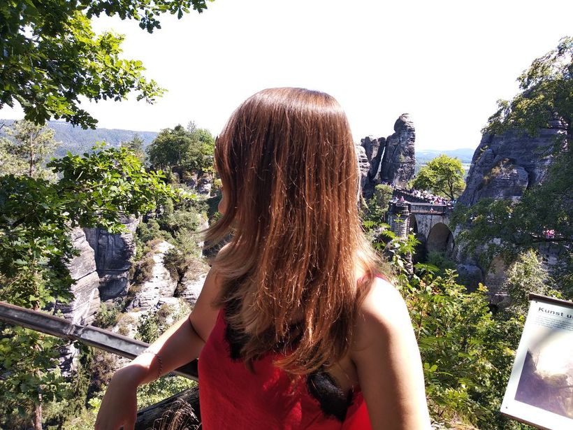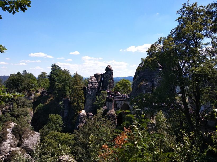 Тут прекрасно все, за исключением толп людей. К самому Баштайбрюкке (легендарному мосту из заставок), непосредственному скоплению скал и смотровым площадкам нужно пройти по широкой аллее, которая идет от стоянки, идти минут 10. По дороге вы сможете увидеть колоритного шарманщика, рыночек с сувенирами и едой, отель и ресторан. А уже дальше сам мост и ответления-дорожки. Ну что я вам скажу? Красиво, очень, аж дух захватывает. Скалы, лес, небо, все создает неповторимую композицию, которой хочется любоваться и любоваться.