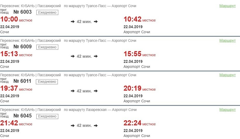 Аэровокзал Сочи находится ближе к Адлеру. В аэропорт вы можете домчаться на скоростной электричке. Поезда имеют пять вагонов разного класса, которые суммарно могут вместить более 400 пассажиров. В вагонах мягкие кресла, есть полки для багажа, а температура в салоне регулируется кондиционером. Дорога в аэропорт займет всего лишь 40 минут. Актуальное расписание смотрите на скриншоте.