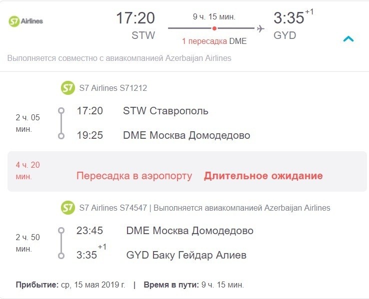 Но перейду к самому перелету. Прямые рейсы из данной воздушной гавани в Баку не осуществляются. До столицы Азербайджана можно добраться с пересадкой в Москве. Вот один из вариантов.