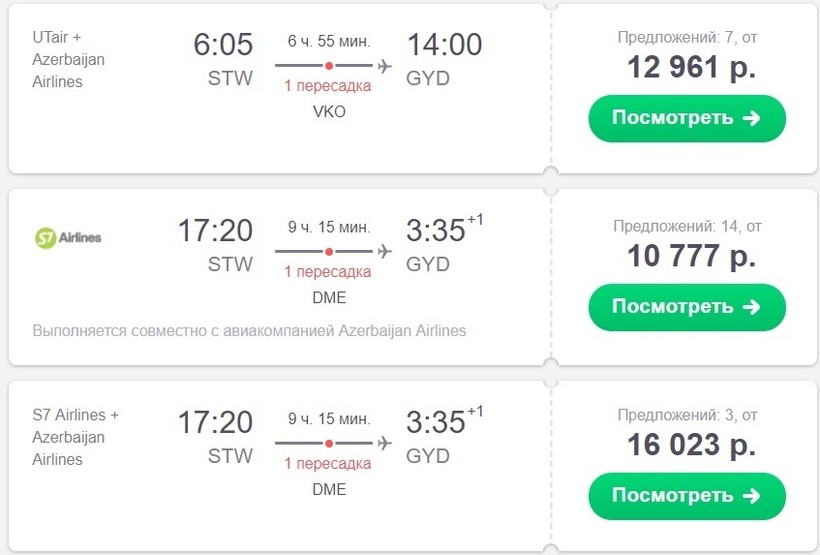 Авиабилет по маршруту Ставрополь — Москва — Баку стоит от 10780 рублей.