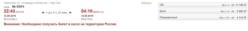 Билеты на поезд до Азербайджана от 6000 рублей.