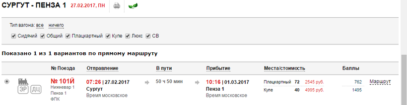 Обычно мы с мужем ездим везде на автомобиле, если это не за 5 тысячи километров от дома, но в этот раз муж сразу сказал, что поедем поездом, так как автомобиль чего-то барахлит и надо его разбирать. Скажу честно, ехать было сложно во всех смыслах этого слова. Но не буду забегать наперед и начну с расписания на 27 число этого месяца. На скриншоте четко видно, что в этот день будет всего лишь один рейс в 07:26. Так же сразу добавлю, что по данному маршруту рейсы есть пару раз в неделю, так что перед тем как спланировать поездку обязательно зайдите на сайте РЖД, чтобы узнать расписание.