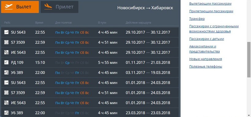 Лететь до Новосибирска примерно 2 часа 15 минут, а вот от него до Хабаровска не меньше 4 часов 55 минут, но это касается лишь перевозчика «Аврора», а вот «ИрАэро» вообще в воздухе на час дольше. Более подробное расписание вы можете глянуть на сайте новосибирского аэропорта.