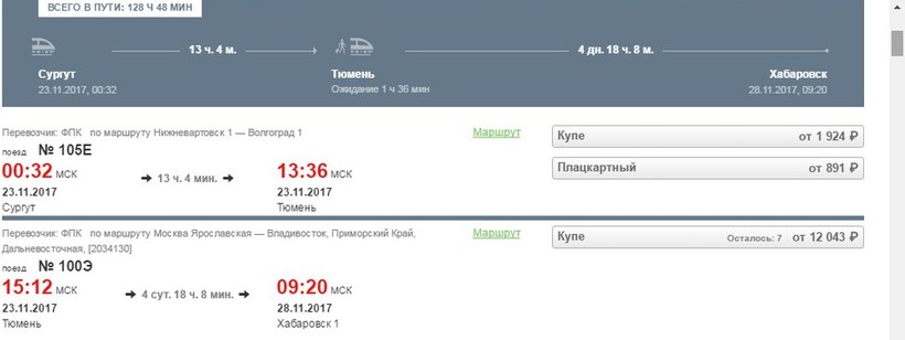 При выборе города обращайте внимание не только на время отправки рейса, но и время в пути. Наиболее удобный вариант проезда через Тюмень, до нее дорога займет всего лишь 13 часов, а вот от нее до Хабаровска 4 дня 18 часов. Если рассматривать другие варианты, то общее время путешествия растягивается до 6 дней, а то и больше. Отправка в Тюмень пару раз в неделю в 03:08, а вот до Хабаровска в 15:12.