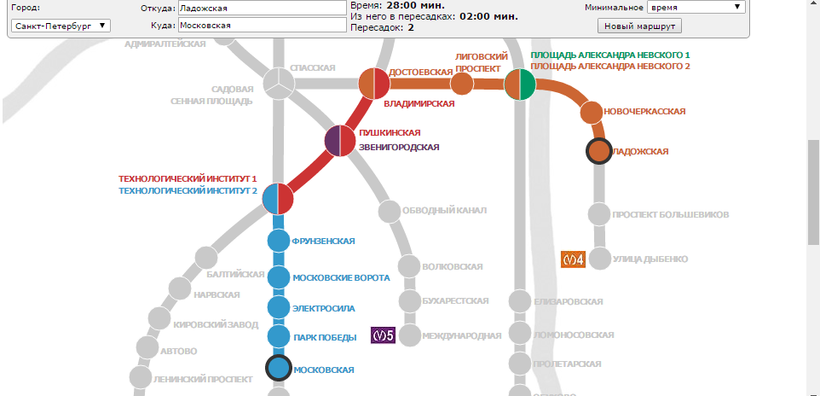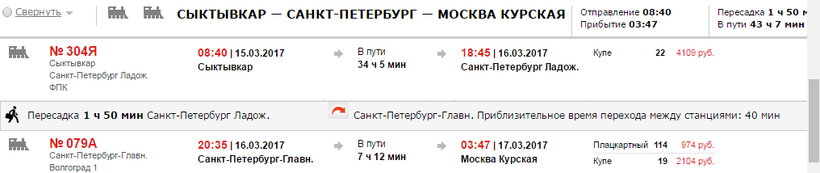 Занимает дорога до пересадочного пункта 1 день 10 часов, но запомните, что прибывают поезда на Ладожский вокзал, однако рейсы до столицы ходят только от Главного (Московского) железнодорожного вокзала Петербурга. Если купите жетон на метро (45 рублей), то сможете за 28 минут доехать от одного вокзала на другой. Я вам сделала скриншот проезда, чтобы вы видели, где надо делать пересадки, а их будет две.