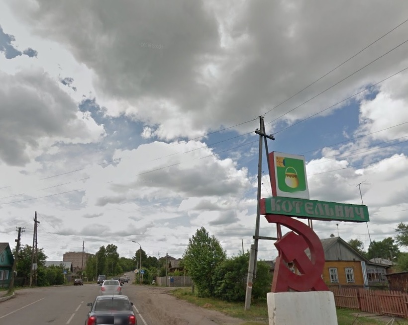 В километре от трассы, левее, течет Вятка, которая через лесной массив не просматривается. В поселке Котельнич она видна из-за заборов, домов.