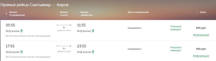 Есть два варианта. Подходящий рейс отправляется от железнодорожного вокзала в Сыктывкаре в шесть вечера, а прибывает в Киров тоже на ж/д вокзал ближе к полуночи.