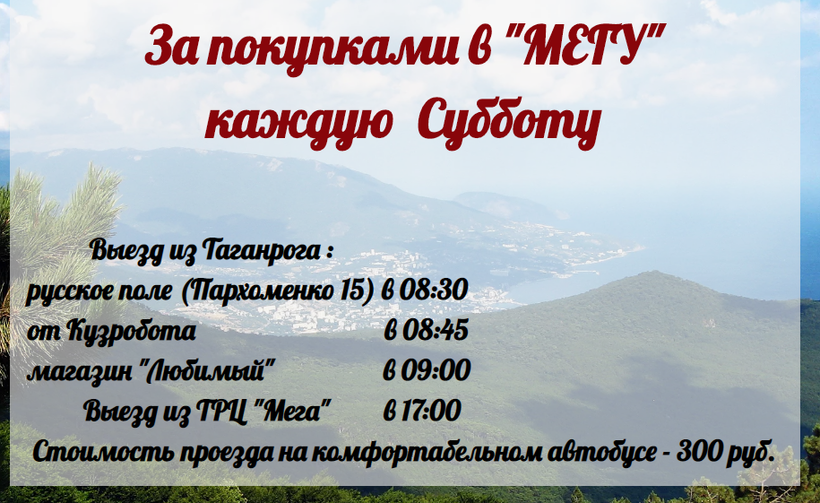 Для тех, у кого нет возможности поехать в Мегу на машине, турагентство Автолайн организует еженедельный выезд на выделенном автобусе. Расписание взято с их официального сайта. Рекомендую заранее уточнить подробности по телефону в Таганроге (легко гуглится). Сама данной услугой не пользовалась, но думаю, будет достаточно комфортно, если устраивает время выезда/приезда.