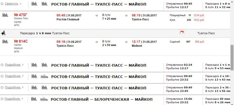 Я этим способом никогда не пользуюсь, потому что он дороже автобусного. К тому же сначала придется на автобусе приехать в Ростов, затем сесть на поезд до Туапсе, так как именно через него можно добраться в пункт назначения. Составы ходят с 00:45 до 23:28, время в дороге занимает 7,5 часов. Ну а потом уже с легкостью можно запрыгнуть в последующий поезд. Рейсы в Майкоп есть на протяжении всего дня, ехать почти 3 часа.