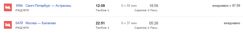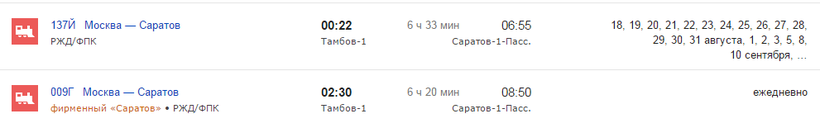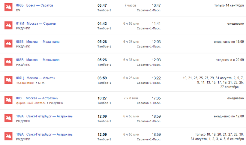 Изо всех транспортных средств для путешествия из Тамбова в Саратов предпочитаю поезд, потому что по маршруту курсирует около 10 составов, и удобно выбирать рейс по времени и стоимости проезда. Дорога займет 6,5 – 7 часов. Хочу отметить, что почти все поезда ходят каждый день и лишь один в фиксированные дни, по средам и воскресеньям. Отправления в Саратов с вокзала Тамбов-1 проходят в ночное и утреннее время, после обеда их уже нет, зато на место прибудете в подходящее время, когда в Саратове курсирует общественный транспорт. Для справки привожу расписание поездов ниже.