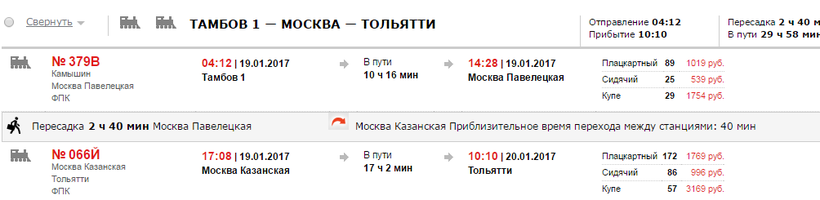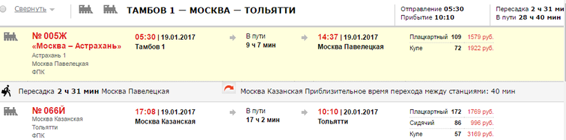 А дальше самое важное. Вам необходимо будет от Павелецкого вокзала перейти на Казанский. Время пересадки занимает 2 часа 40 минут, а если вы сядете на метро, чтобы доехать до Казанского вокзала, то потратите не больше 20 минут. Выйдя из вокзала, вы увидите вход на станцию метро. Сесть надо на коричневую ветку и без пересадок доехать до Комсомольской станции, выйдя на улицу, увидите Казанский вокзал. От Москвы поезд отправляется в 17:10, ехать до Тольятти 17 часов. В общей сложности на дорогу уйдет 1 день 6 часов.