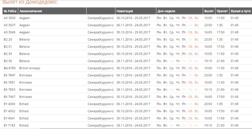 Кстати, аэропорт Самары называется Курумоч. На сайте аэропорта Домодедово вы можете посмотреть, когда отправляются рейсы и в какие дни недели. Чтобы вам было удобнее я прикреплю скриншот, где видна вся необходимая информация. Лететь до Самары 1 час 45 минут.