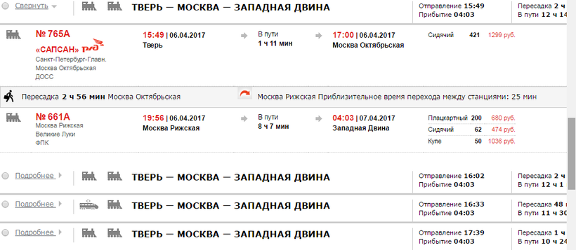 Поскольку в Западной Двине есть железнодорожные пути, то добраться можно на поезде, однако сделать это возможно только через Москву. Получается, что сначала надо ехать из Твери до столицы, а только потом сесть на поезд до конечного пункта. Я не буду ходить вокруг да около и покажу расписание, скажем, на 6 марта. Сразу видно, что в этот день будет четыре рейса: