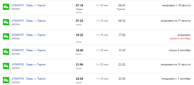 Подойдут только утренние и дневные электрички, отправляющиеся из Твери в Торжок, если ехать на вечерней, то на нужный рейс не успеешь.