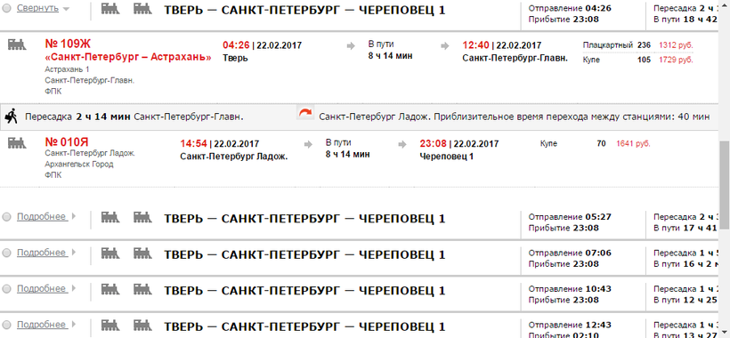 Перед тем как планировать поездку вам необходимо знать, что напрямую доехать из Твери в Череповец невозможно. Однако расстраиваться не стоит, так как можно это сделать с пересадкой в Санкт-Петербурге. Я решила показать вам расписание на 22 февраля, чтобы вы увидели, что в этот день будет несколько рейсов: