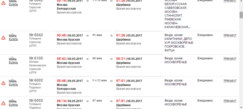 Ну а дальше все просто и нужно лишь сделать пересадку на Курский вокзал, от которого идут электропоезда в сторону Щербинки. Курсируют они с 00:14 до 23:40, а по времени ехать чуть больше 40 минут. Я специально сделала вам скриншот, на котором видно, что некоторые маршруты помечены, это значит, что в расписании есть изменения. Так что я вам советую всегда проверять график.