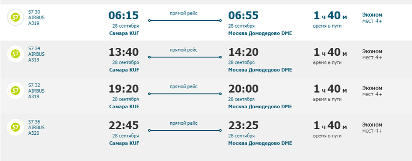 Более легкий способ, это, конечно же, самолет. Время в небе займет неполных два часа, вы с комфортом долетите и не будете мучится в дальней дороге. Из Самарского аэропорта Курумоч идут прямые рейсы в Москву. По расписанию видно, что на завтра есть рейсы на разное время, от авиакомпании «S7» прошу заметить, что все они идут в аэропорт Домодедово.