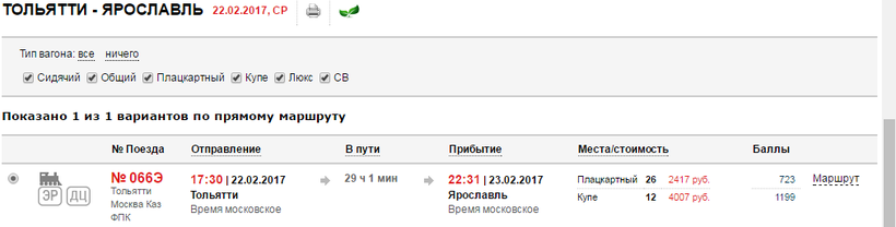Практически ежедневно от Тольяттинского железнодорожного вокзала отправляются рейсы до Ярославля, хотя если быть точнее, то до Москвы, а Ярославль будет промежуточным пунктом. Вот на следующую среду будет один прямой рейс в 17:30.