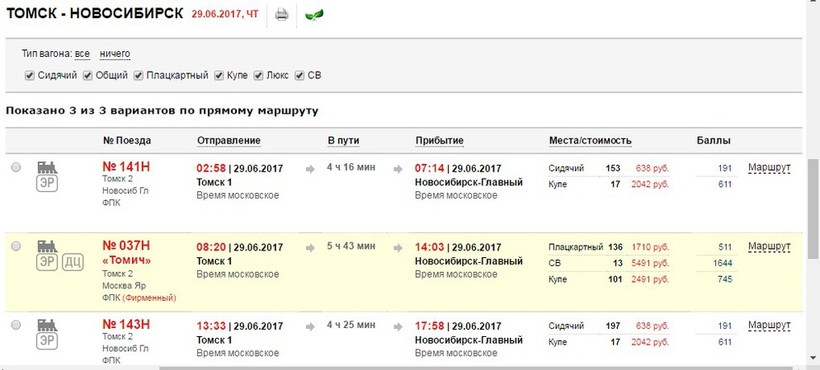 - Цена проезда в Новосибирск будет разниться, к примеру, если взять билет на сидячее место, то отдадите всего лишь 638 рублей, а вот в плацкартный вагон уже будет дороже — 1710 рублей.