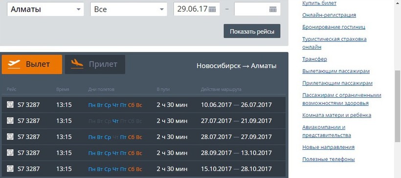 Воздушный путь будет в два этапа, потому что из Томска самолеты в Алма-Ату не летают, а вот из Новосибирска еще как. Так что придется воспользоваться услугами авиакомпании «Россия» и за 1 час 5 минут оказаться на аэродроме пересадочного узла. Обратите внимание, что сейчас можно только этой компанией и долететь, да и то только по понедельникам, средам и пятницам.