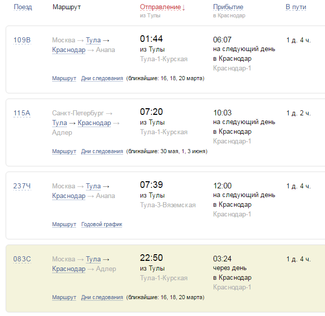 - стоимость билета на поезд из Тулы до Краснодара — от 2586 рублей (плацкарт) до 4336 рублей (купе);