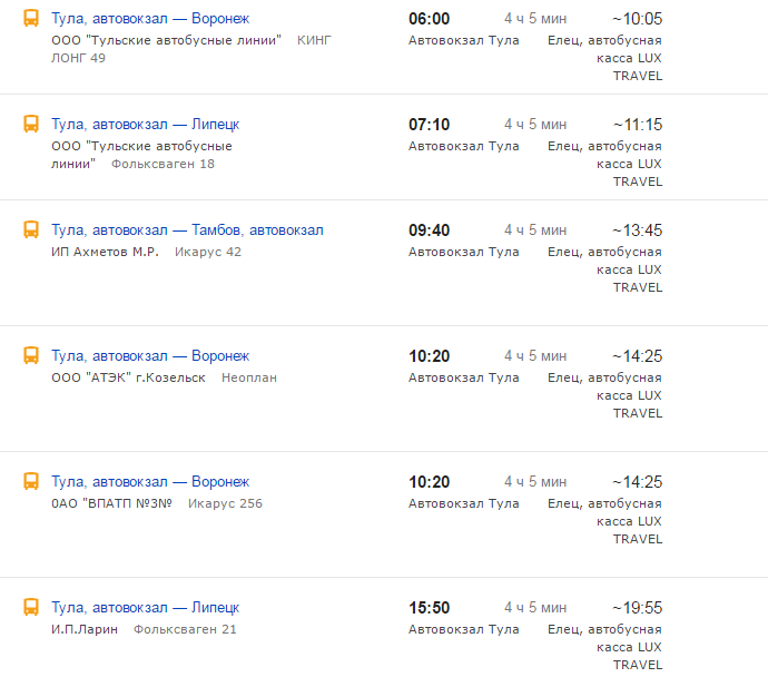 Ниже приведена информация о том, сколько часов вам потребуется, чтобы добраться от Тулы до Ельца, а также приведена примерная стоимость проезда (средняя цена билета) на том или ином виде транспорта.