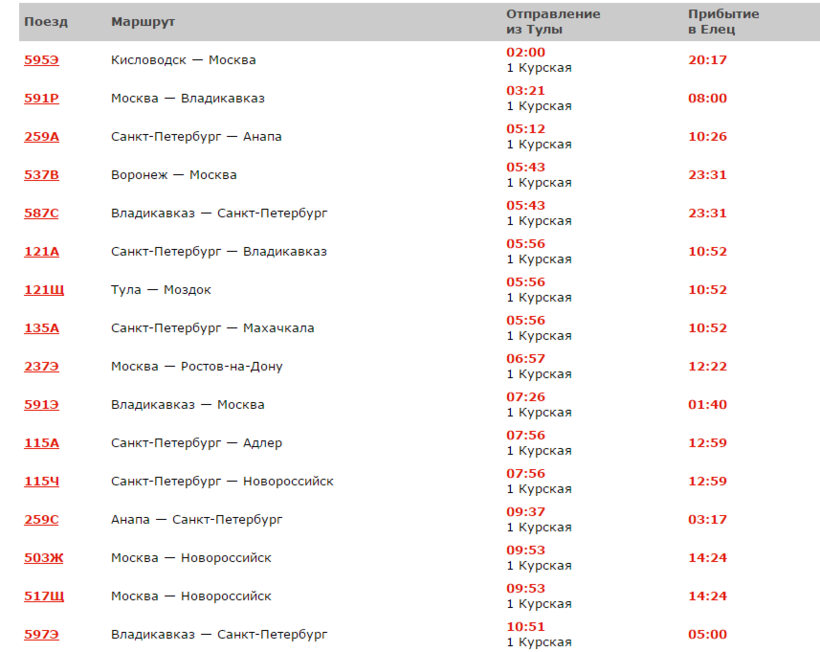 Добраться до Ельца можно и по железной дороге некоторыми поездами южного и северокавказского направления, следующими через него. Отправление поездов с Московского вокзала Тулы (ул. Путейская, 4).