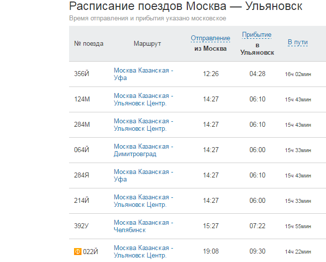 Самый комфортный, удобный и быстрый по времени в пути - фирменный поезд 022Й с отправлением из Москвы в 19-08 и прибытием в Ульяновск в 9-30 утра. Время в пути - 14 часов 22 минуты. Остальные поезда идут на час-два дольше, да и прибывают в Ульяновск рано утром.