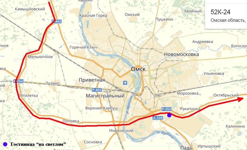 Омск объезжаем по схеме, данной на рисунке. Через западный обход и Южный мост уходим на Новосибирский тракт. Короче, двигаемся по указателям «Новосибирск».