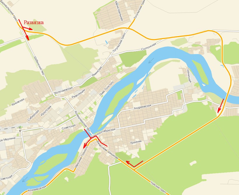 Бийск можно проехать через город или в объезд. Пробок в Бийске нет. Через город дорога хуже, а в объезд – длиннее. Решайте сами.