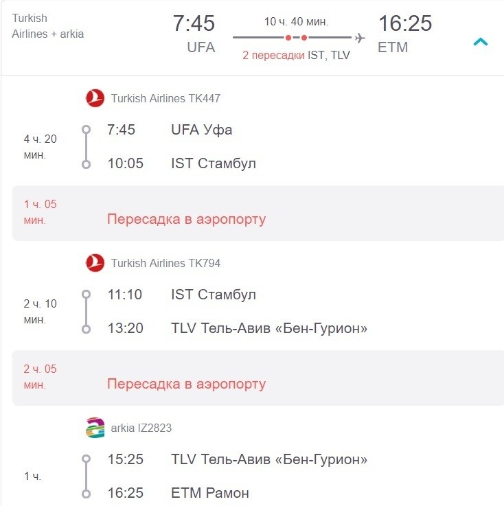 Сначала нужно попасть в Стамбул, затем — в Тель-Авив, и оттуда уже сесть на прямой самолет до Эйлата. Весь путь займет почти одиннадцать часов.