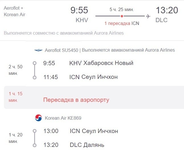 Первый рейс выполняет Aeroflot совместно с Aurora Airlines, а второй осуществляет Korean Air.