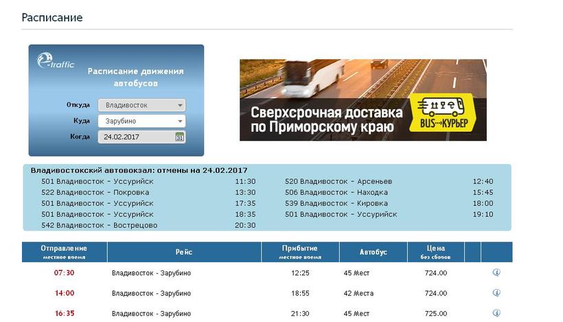От хабаровского автовокзала ежедневный рейс № 701 отправляется в 8:50 и приходит во Владик в 23:15. Продолжить путь можно только на следующий день, есть три рейса, самый ранний из них в 7:30.