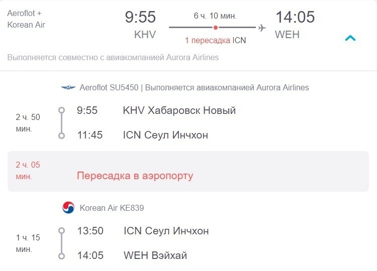 Прямые рейсы отсюда до Вэйхая не осуществляются, нужно лететь с пересадкой. Ее оптимальнее всего сделать в Сеуле. Аэровокзал здесь называется «Инчхон». Вот один из вариантов.