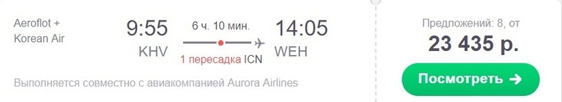 На дорогу потратите шесть часов с небольшим. Рейсы осуществляют Aeroflot совместно с Aurora Airlines и Korean Air.