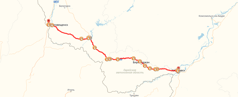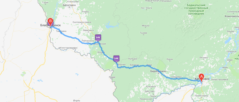 К сожалению, напрямую от Хабаровска до Хэйхе на машине не добраться, необходимо сначала доехать до Благовещенска, а потом сесть на паром (машину придется оставить на платной стоянке). Расстояние до Благовещенска - примерно 700 км, не торопясь можно доехать часов за 7-8. Дорога широкая, двухполосная, и если вы уверенный водитель, то доберетесь примерно часов за 7. Из Хабаровска выезжайте по трассе Р297, после Новобурейска сворачивайте на Р461 и едьте до самого Благовещенска. С заправками по трассе проблем нет, вот подробная карта с расположением АЗС: