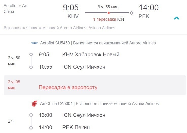 На дорогу потратите семь часов. Рейсы выполняют данные компании: Aeroflot и Air China совместно с Asiana Airlines.